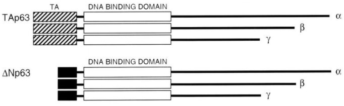 Anti-p63 Purified Fig. 1: Comparison of p63 isoforms: transactivation isoform TAp63, and deltaNp63 without transactivation domain (Signoretti et al., Am J Pathol. 2000, 157(6):1769-75). Fig. 2: Western blotting analysis of p63 isoforms using mouse monoclonal antibody PANp63.1. This antibody detects both TAp63 and deltaNp63 isoforms, as demonstrated on particular transfectants.