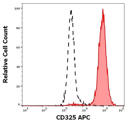 CD325 (N-cadherin) is a type I transmembrane protein, which forms a complex with catenins, that is linked to the actin cytoskeleton. This complex is important in synapses and for functional plasticity of neurons, and is also essential for embryonic development. CD325 plays key roles in morphogenetic processes during the formation of neural and cardiac tissues, and it is also involved in skeletal myogenesis, osteogenesis, and in the maturation of the vasculature. Decreased CD325 cleavage caused by mutations in presenilin 1 is associated with Alzheimer´s disease. Unlike healthy epithelium, epithelial cancers, including prostate, lung and bladder cancer, do express CD325, and this aberrant expression is a negative prognostic factor. CD325 is also expressed on the surface of malignant T cells, and increases their adhesion to epithelia, as well as their ability to invade and metastasize to inflammatory sites. Although it is not considered as an oncogen, it strongly supports tumor aggressiveness by promotion of both individual and collective cell migration. CD325 represents a therapeutic target to inhibit cancer metastasis. This protein also plays roles in haematological malignancies, e.g. by supporting their adhesion to bone marrow stromal cells. Fig. 1: CD325 chains form oligomers by interaction of their last two extracellular domains. These oligomers adhere to their counterparts on a target cell. Intracellular side of these junctions are attached to the actin cytosleleton. The mouse monoclonal antibody 8C11 recognizes an extracellular epitope of human and murine CD325, and can be used for flow cytometry, Western blotting, immunocytochemistry, immunohistochemistry, and immunoprecipitation. Formats: Purified (11-849-C100), Alexa Fluor® 488 (A4-849-T100), PE (1P-849-T100), APC (1A-849-T100), Alexa Fluor® 647 (A6-849-T100), PE-Cy™7 (T7-849-T100). Fig. 2: Separation of HeLa cells stained using anti-human CD325 (8C11) APC antibody (10 μl reagent per million cells in 100 μl of cell suspension, red-filled) from HeLa cells stained using mouse IgG1 isotype control (MOPC-21) APC antibody (concentration in sample 15 μg/ml, the same as CD325 APC concentration, black-dashed) in flow cytometry analysis (surface staining). Further reading: Nieman MT et al.: N-cadherin promotes motility in human breast cancer cells regardless of their E-cadherin expression. J Cell Biol. 1999, 147(3): 631-644. Derycke LD and Bracke ME: N-cadherin in the spotlight of cell-cell adhesion, differentiation, embryogenesis, invasion and signaling. Int J Dev Biol. 2004, 48: 463-476. Groen RW et al.: N-cadherin-mediated interaction with multiple myeloma cells inhibits osteoblast differentiation. Haematologica 2011, 96(11): 1653-1661. Mrozik KM et al.: N-cadherin in cancer metastasis, its emerging role in haematological malignancies and potential as a therapeutic target in cancer. BMC Cancer 2018, 18:939-954. Cao ZQ et al.: Aberrant N-cadherin expression in cancer. Biomed. Pharmacotherapy 2019, 118:109320. Sun Y et al.: N-cadherin inhibitor creates a microenvironment that protects TILs from immune checkpoints and Treg cells. J Immunother Cancer 2021, 9:e002138. Barcelona-Estaje E et al.: N-cadherin crosstalk with integrin weakens the molecular clutch in response to surface viscosity. Nat Communications 2024, 15:8824.