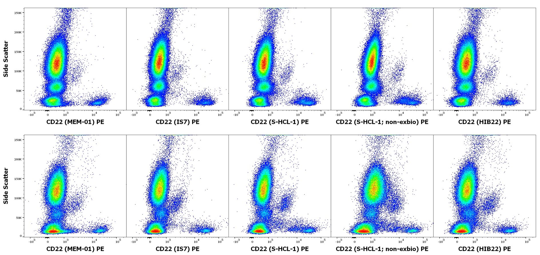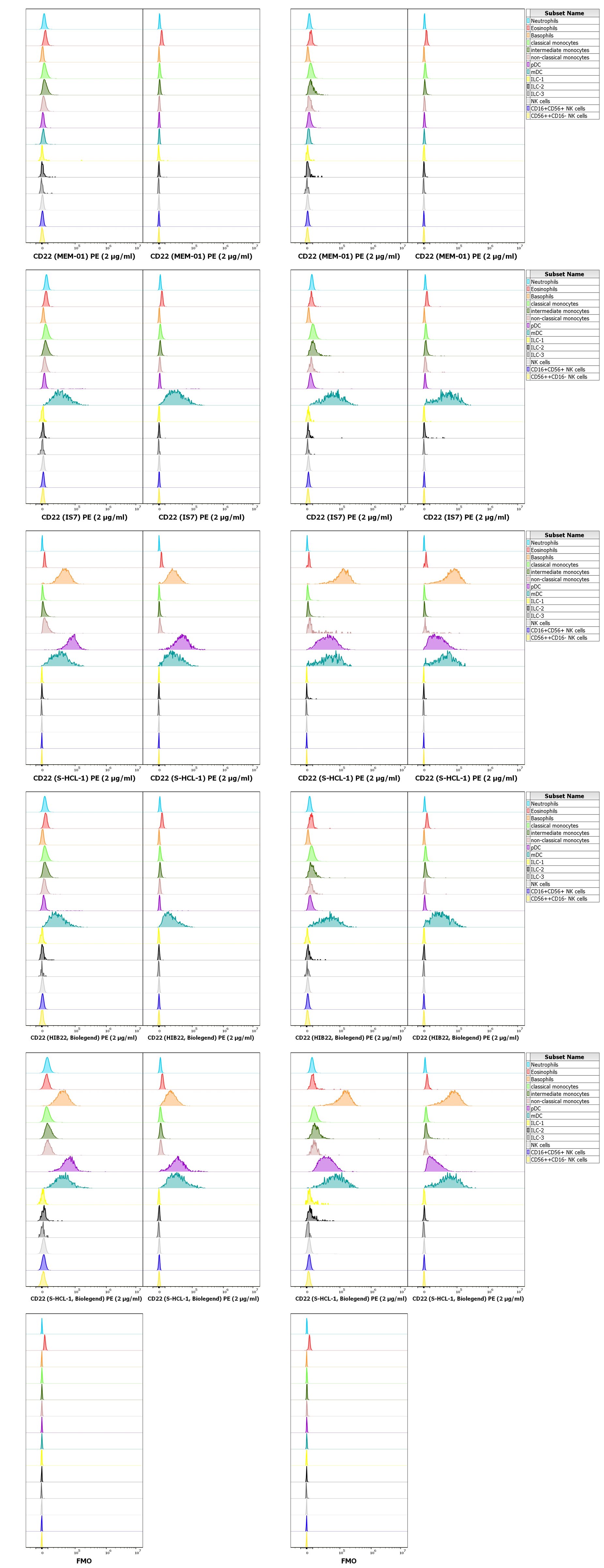 Here we present our results of experiments aimed at characterizing the specificity of various anti-CD22 antibody clones in human peripheral blood and evaluating potential off-target staining on non-B cell populations such as myeloid dendritic cells (mDCs), plasmacytoid dendritic cells (pDCs), and basophils, as well as the intracellular staining abilities of these clones. At first, we analyzed the staining profile and other staining parameters of four anti-human CD22 clones - MEM-01, IS7, S-HCL-1 and HIB22 on peripheral whole blood of two healthy blood donors. Antibody conjugates with PE were titrated at 3 concentrations (3.75, 1.43 and 0.45 µg/ml). In Fig. 1, Staining profiles at 1.43 µg/ml are shown. In Fig. 2, dot-plot graphs CD22 PE vs. CD19 APC-Cy™7 showing side scatter middle and low leukocytes when stained with all four clones are presented.