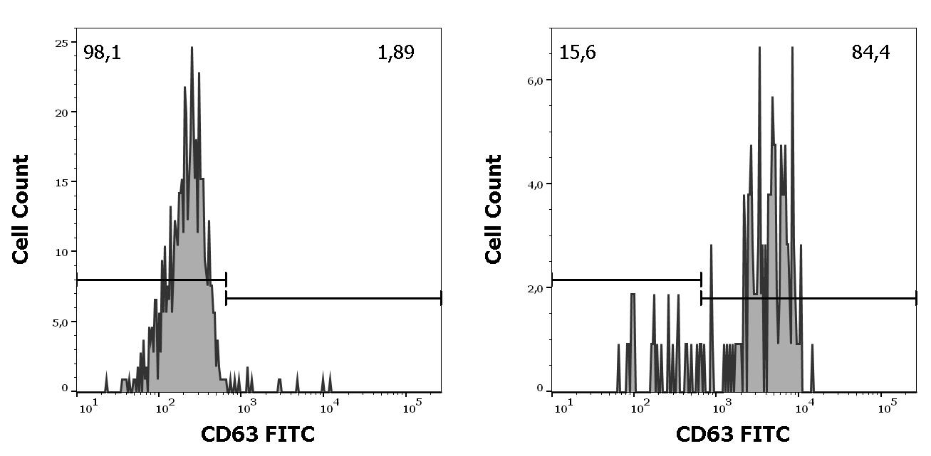 Left: Negative control sample. Basophils of non-stimulated human peripheral whole blood of a proven allergic donor in the presence of stimulation buffer stained using anti-human CD63 (MEM-259) FITC and anti-human CD203c (NP4D6) PE antibodies of BasoFlowEx kit.
