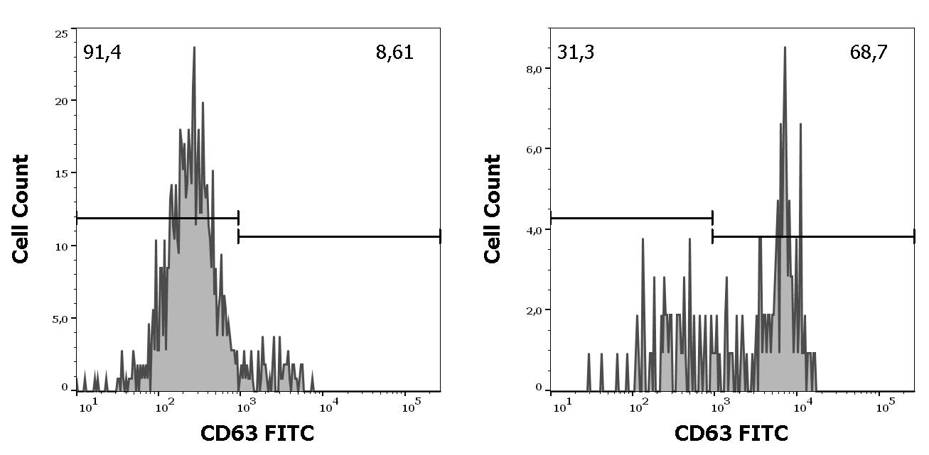 Right: Allergen-stimulated sample. Separation of CD63 positive basophils (68.7 %) from CD63 negative basophils (31.3 %) in flow cytometry analysis (surface staining) of Hen egg yolk (f75) extract stimulated human peripheral whole blood of a proven allergic donor stained using anti-human CD63 (MEM-259) FITC and anti-human CD203c (NP4D6) PE antibodies of BasoFlowEx kit.