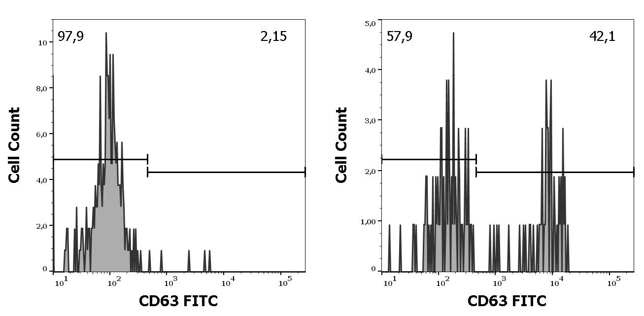 Right: Allergen-stimulated sample. Separation of CD63 positive basophils (42.1 %) from CD63 negative basophils (57.9 %) in flow cytometry analysis (surface staining) of Timothy grass (g6) extract stimulated human peripheral whole blood of a proven allergic donor stained using anti-human CD63 (MEM-259) FITC and anti-human CD203c (NP4D6) PE antibodies of BasoFlowEx kit.