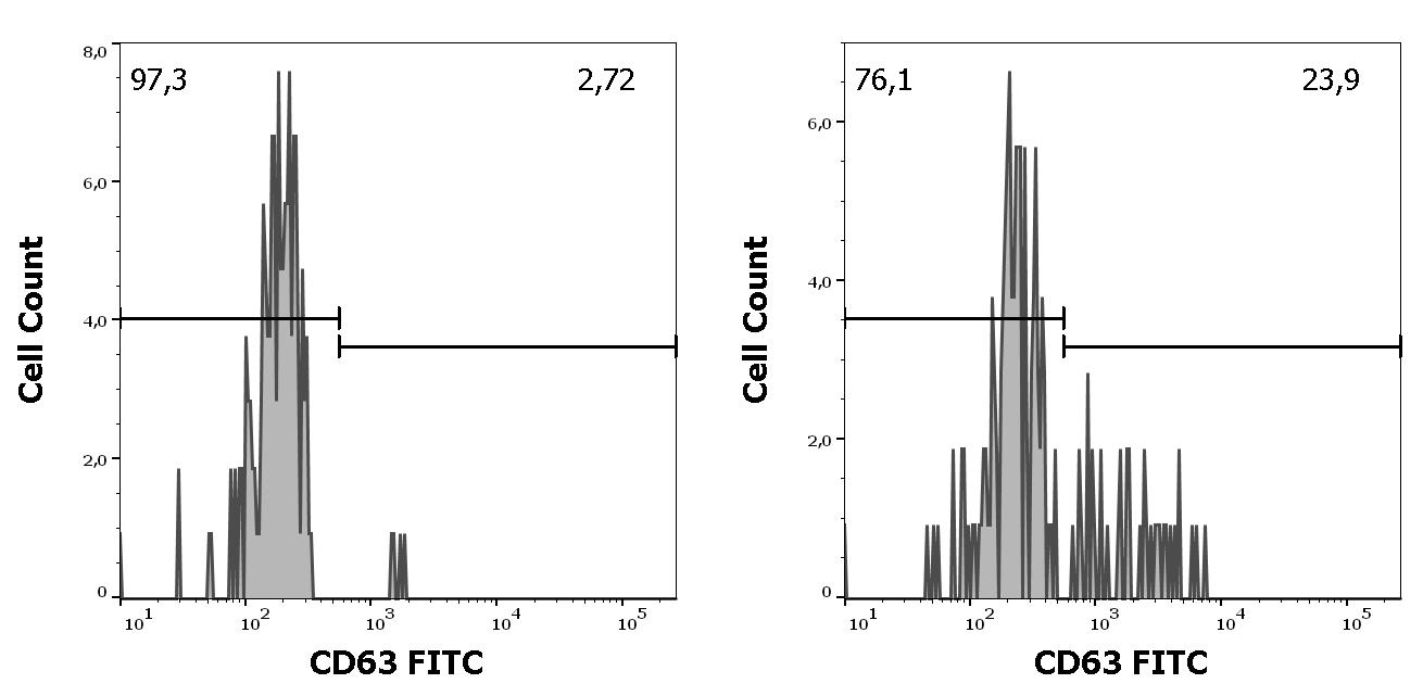 Left: Negative control sample. Basophils of non-stimulated human peripheral whole blood of a proven allergic donor in the presence of stimulation buffer stained using anti-human CD63 (MEM-259) FITC and anti-human CD203c (NP4D6) PE antibodies of BasoFlowEx kit.