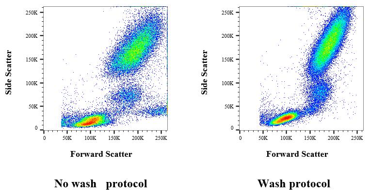 Peripheral whole blood lysed using EXCELLYSE Easy according to No-wash protocol (left) and a Wash protocol (right).