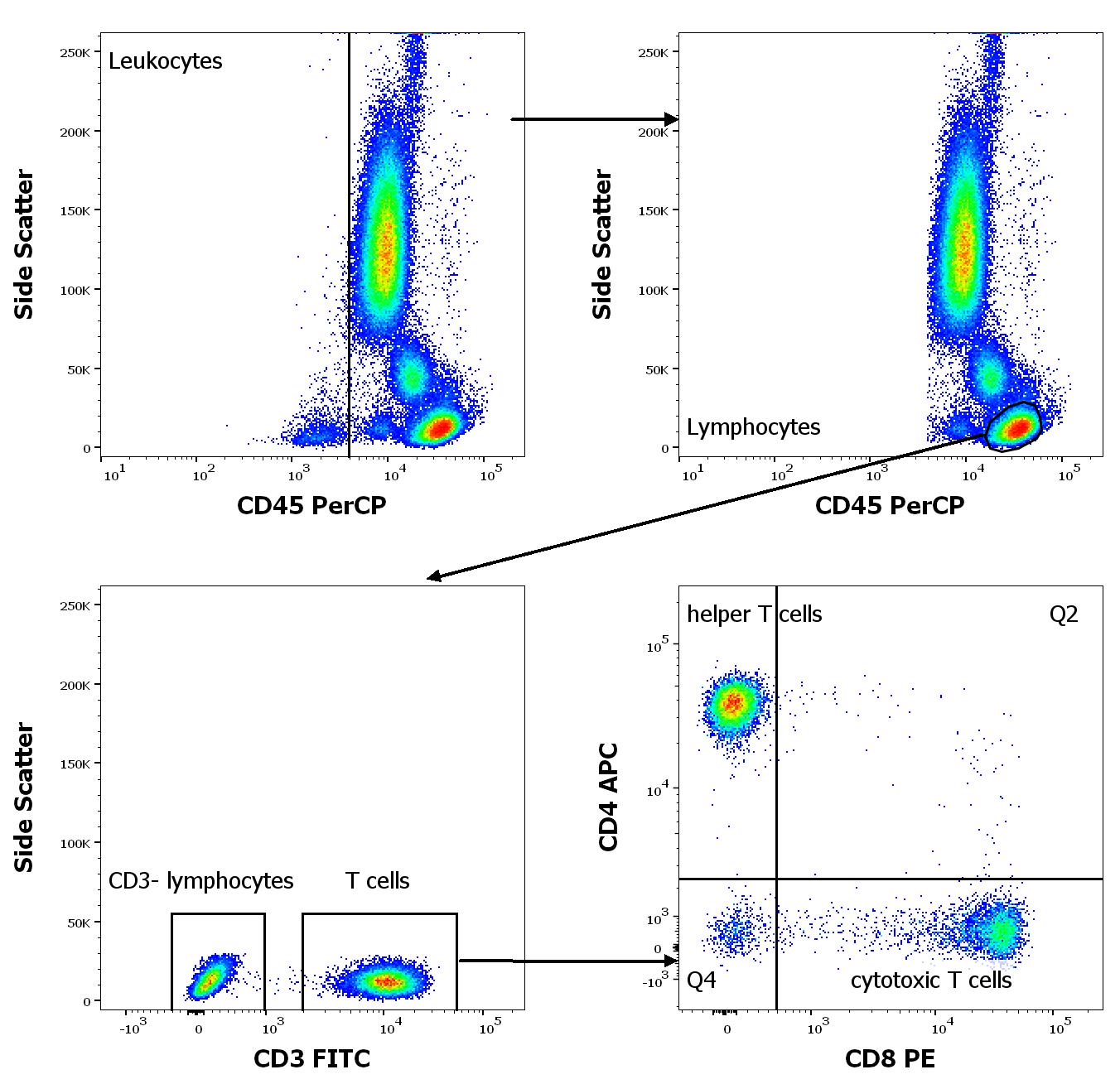 Flow cytometry gating strategy for identification of target cell populations in normal human peripheral whole blood.