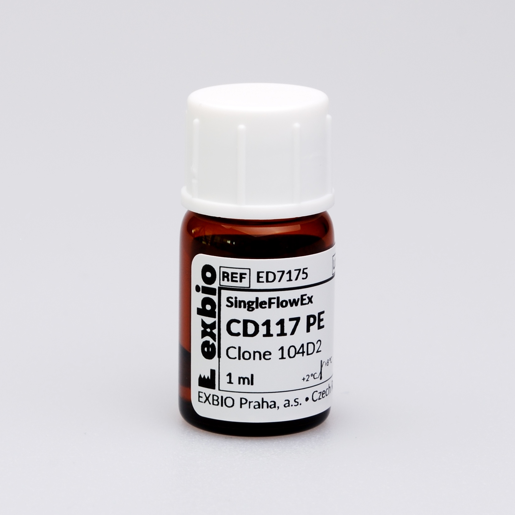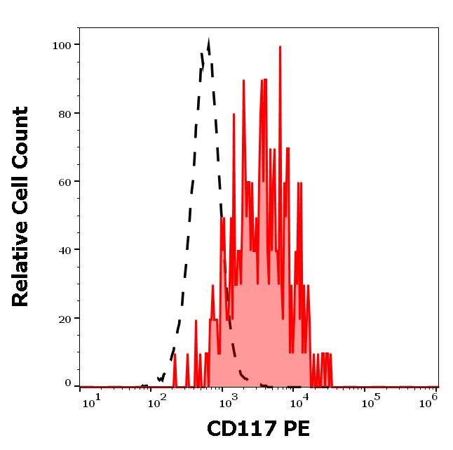 Example of separation of positive (red-filled) and negative (black-dashed) events using SingleFlowEx CD117 PE