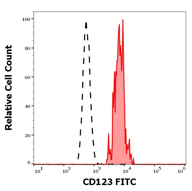 Example of separation of positive (red-filled) and negative (black-dashed) events using SingleFlowEx CD123 FITC