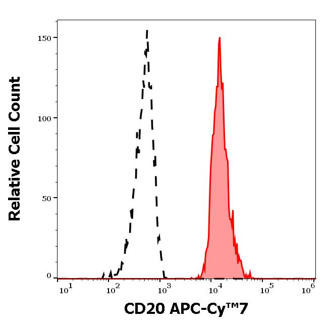 Example of separation of positive (red-filled) and negative (black-dashed) events using SingleFlowEx CD20 APC-Cy™7