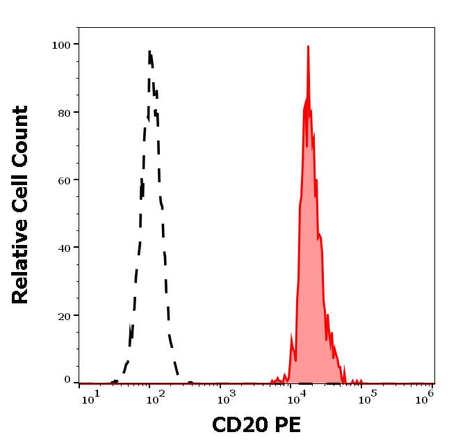 Example of separation of positive (red-filled) and negative (black-dashed) events using SingleFlowEx CD20 PE