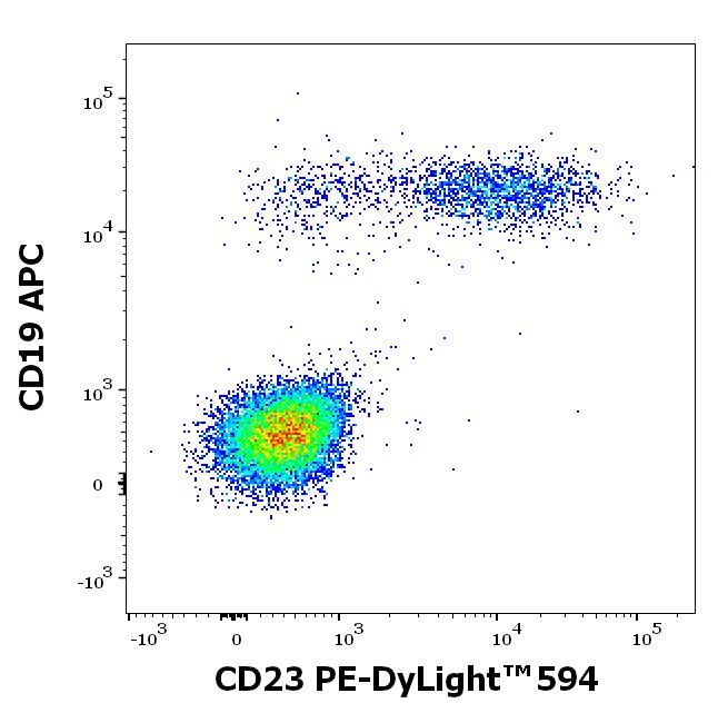 Graphic display: gated CD45 positive lymphocytes displayed as SingleFlowEx CD23 PE-DyLight™ 594 versus CD19 APC