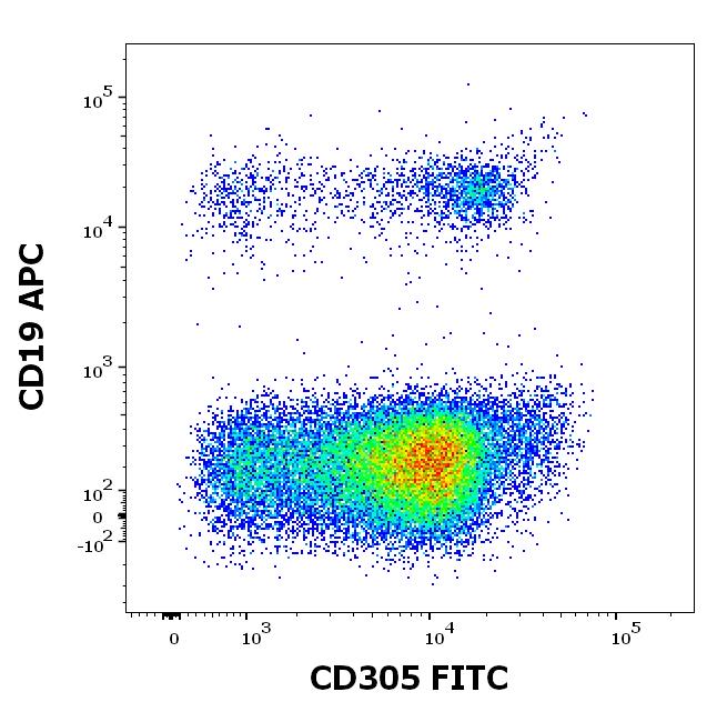 Graphic display: gated CD45 positive lymphocytes displayed as SingleFlowEx CD305 FITC versus CD19 APC