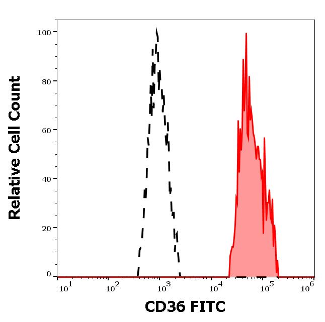 Example of separation of positive (red-filled) and negative (black-dashed) events using SingleFlowEx CD36 FITC