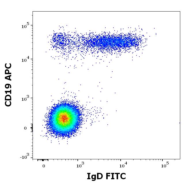 Graphic display: gated CD45 positive lymphocytes displayed as SingleFlowEx IgD FITC versus CD19 APC