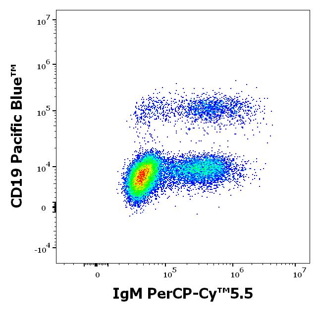 Graphic display: gated CD45 positive lymphocytes displayed as SingleFlowEx IgM PerCP-Cy™5.5 versus CD19 Pacific Blue™
