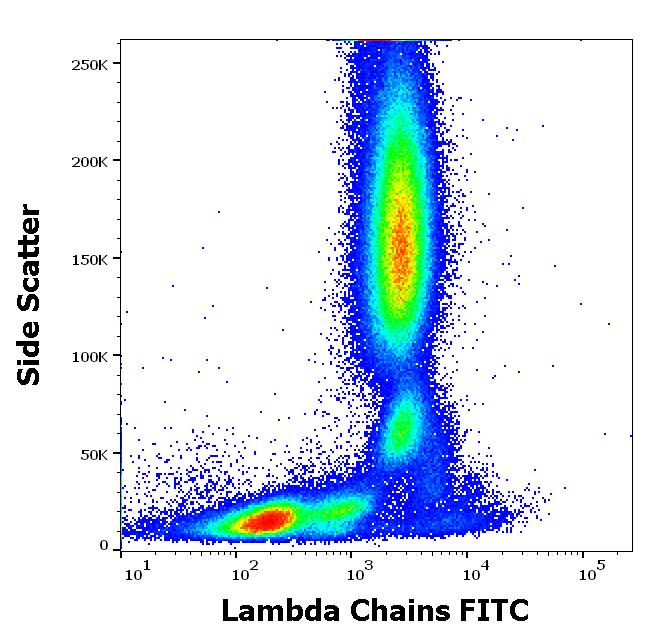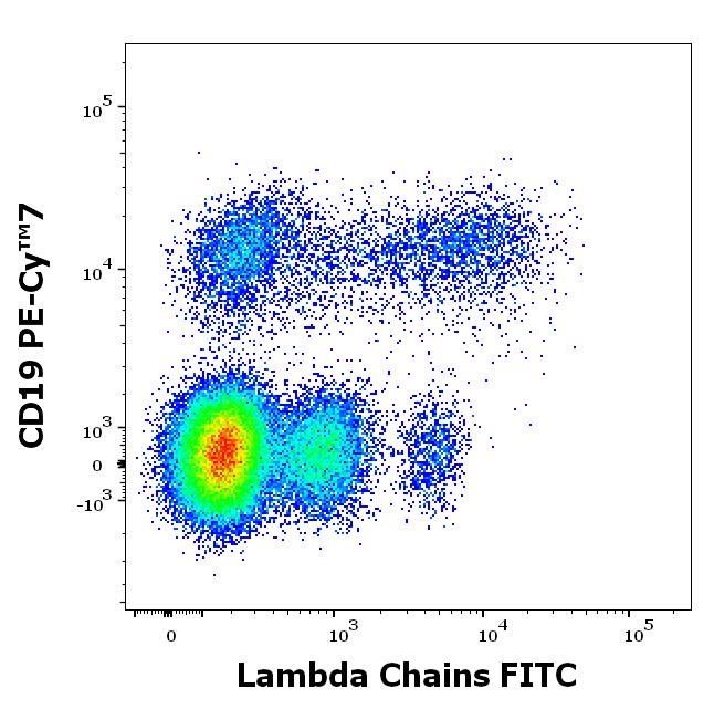 Graphic display: gated CD45 positive lymphocytes displayed as SingleFlowEx Lambda Chains FITC versus CD19 PE-Cy™7