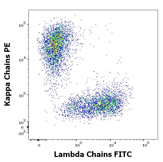 Graphic display: gated CD45 positive CD19 positive lymphocytes displayed as SingleFlowEx Lambda Chains FITC versus Kappa Chains PE