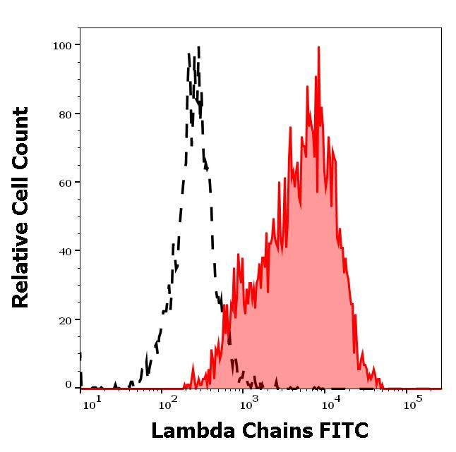 Example of separation of positive (red-filled) and negative (black-dashed) events using SingleFlowEx Lambda Chains FITC