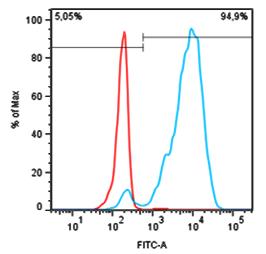 Separation of human monocytes after E. coli FITC stimulation (blue) from nonstimulated monocytes (red) in flow cytometry analysis of human peripheral whole blood (shown data from FITC detector).