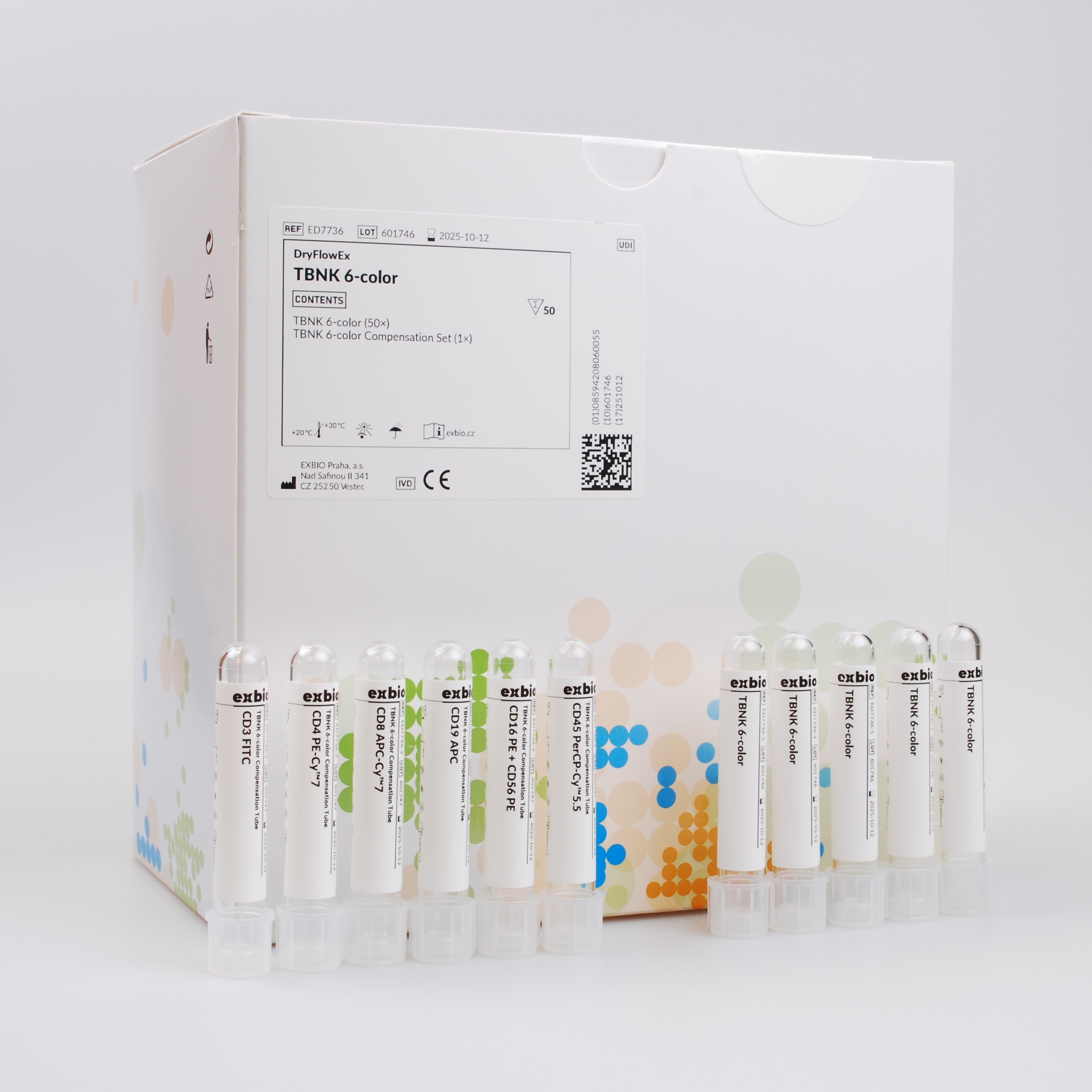 TBNK 6-color Compensation Set ED7736-2 (1 pouch) containing 6 capped single-use tubes, each containing single fluorochrome-labeled reagent dried with the stabilizing ingredients as a layer at the bottom of the tube (12 x 75 mm).
