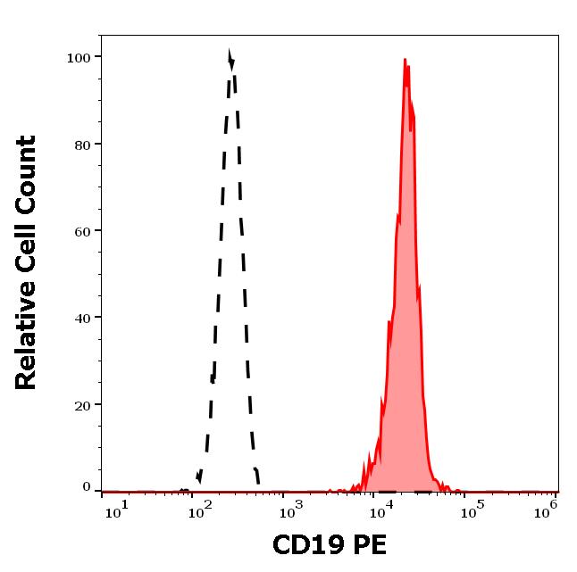 Histogram showing separation of human CD19 positive B cells (red-filled) from CD19 negative cells - neutrophil granulocytes (black-dashed) in flow cytometry analysis (surface staining) of human peripheral whole blood after erythrocyte lysis from a healthy donor stained using CD19 (LT19) PE antibody (20 μl reagent / 100 μl of peripheral whole blood).