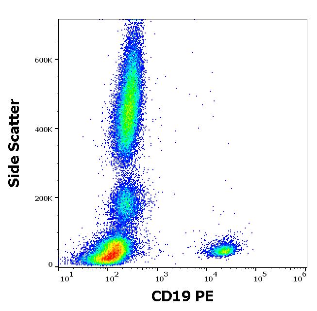 Flow cytometry surface staining pattern of human peripheral whole blood after erythrocyte lysis from a healthy donor stained using CD19 (LT19) PE antibody (20 μl reagent / 100 μl of peripheral whole blood).