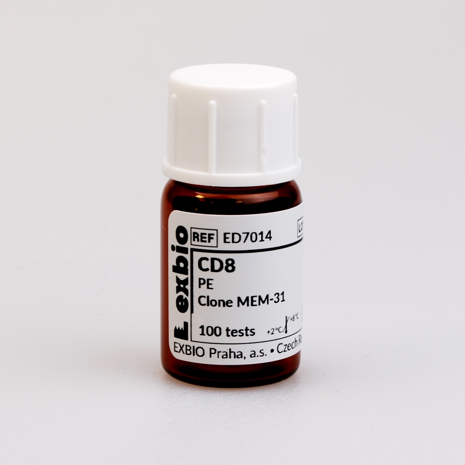 The reagent contains mouse monoclonal antibody against human CD8 antigen (clone MEM-31) which was purified by affinity chromatography and labeled with R-Phycoerythrin (PE). The labeled antibody is diluted at optimum concentration in stabilizing phosphate buffered saline (PBS) solution containing 15mM sodium azide. The content of a vial (2 ml) is sufficient for 100 tests.
