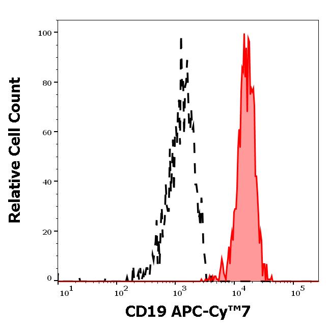 Example of separation of positive (red-filled) and negative (black-dashed) events using SingleFlowEx CD19 APC-Cy™7