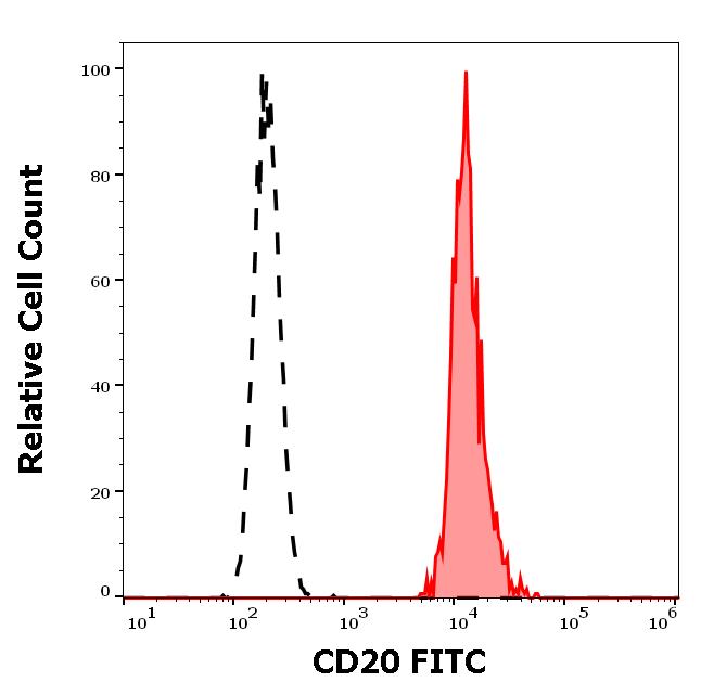 Example of separation of positive (red-filled) and negative (black-dashed) events using SingleFlowEx CD20 FITC