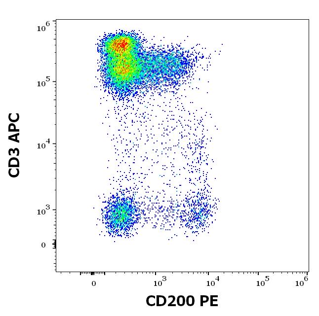 Graphic display: gated CD45 positive lymphocytes displayed as SingleFlowEx CD200 PE versus CD3 APC