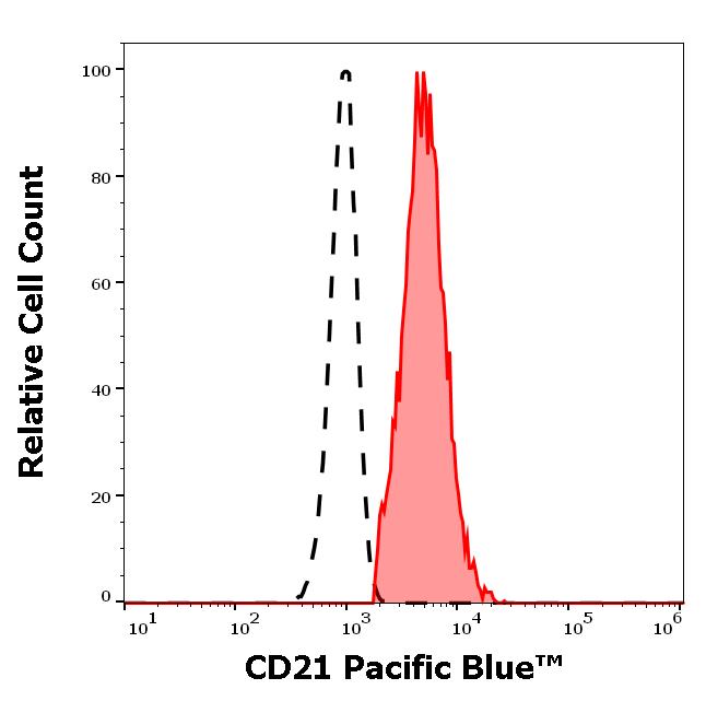 Example of separation of positive (red-filled) and negative (black-dashed) events using SingleFlowEx CD21 Pacific Blue™