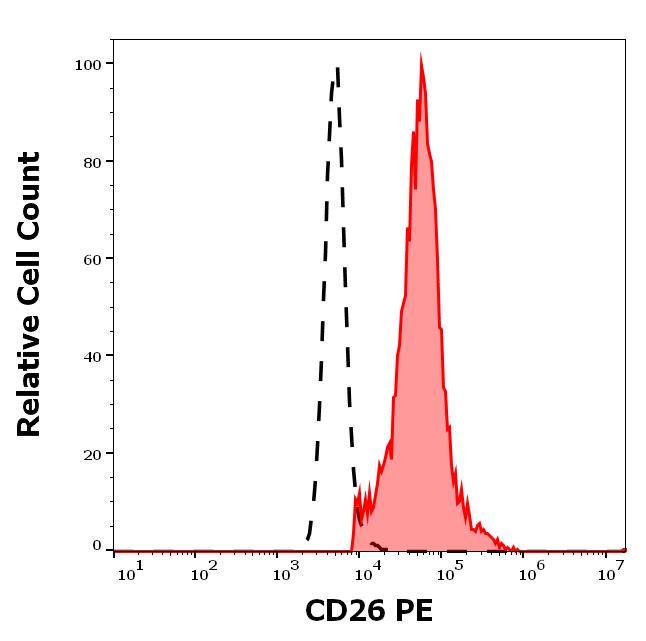 Example of separation of positive (red-filled) and negative (black-dashed) events using SingleFlowEx CD26 PE