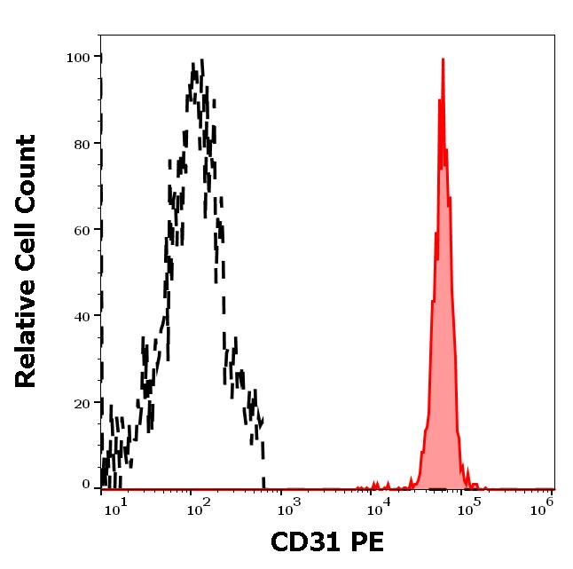 Example of separation of positive (red-filled) and negative (black-dashed) events using SingleFlowEx CD31 PE