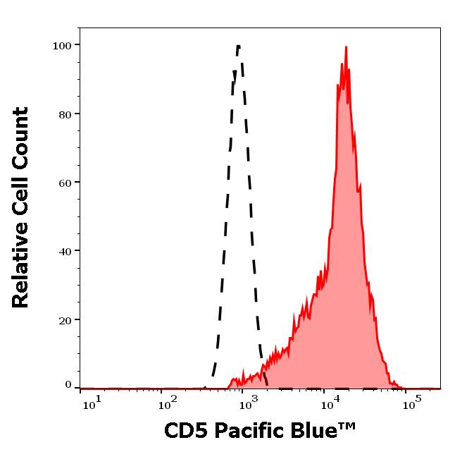 Example of separation of positive (red-filled) and negative (black-dashed) events using SingleFlowEx CD5 Pacific Blue™