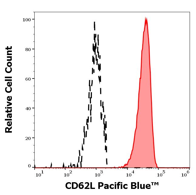 Example of separation of positive (red-filled) and negative (black-dashed) events using SingleFlowEx CD62L Pacific Blue™