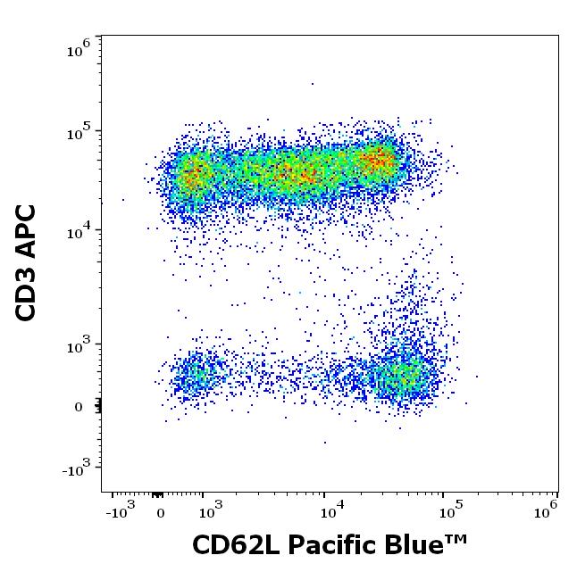 Graphic display: gated CD45 positive lymphocytes displayed as SingleFlowEx CD62L Pacific Blue™ versus CD3 APC