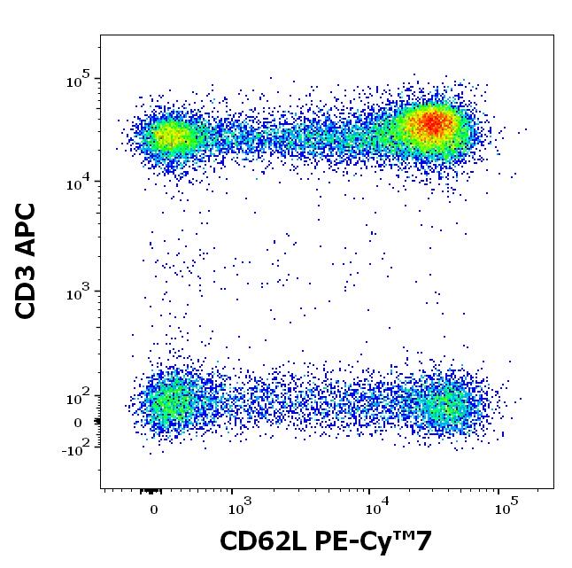 Graphic display: gated CD45 positive lymphocytes displayed as SingleFlowEx CD62L PE-Cy™7 versus CD3 APC