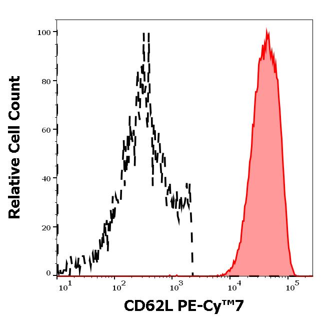 Example of separation of positive (red-filled) and negative (black-dashed) events using SingleFlowEx CD62L PE-Cy™7