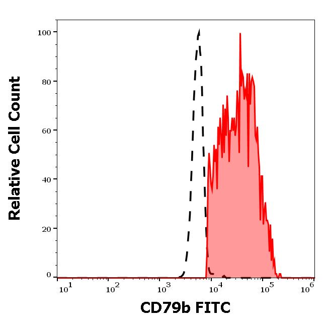 Example of separation of positive (red-filled) and negative (black-dashed) events using SingleFlowEx CD79b FITC