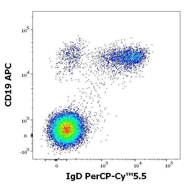 Graphic display: gated CD45 positive lymphocytes displayed as SingleFlowEx IgD PerCP-Cy™5.5 versus CD19 APC