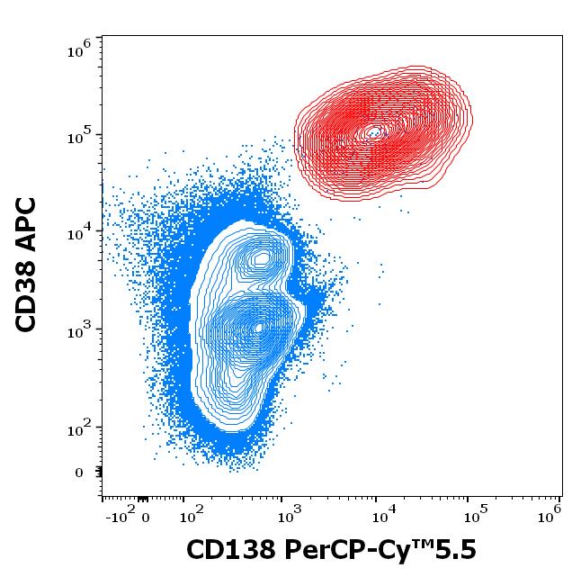 Graphic display: gated CD45 positive mononuclear cells displayed as SingleFlowEx CD138 PerCP-Cy™5.5 versus CD38 APC