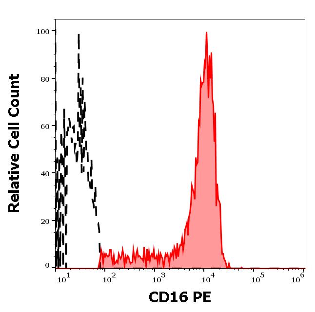 Example of separation of positive (red-filled) and negative (black-dashed) events using SingleFlowEx CD16 PE