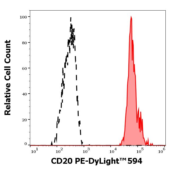 Example of separation of positive (red-filled) and negative (black-dashed) events using SingleFlowEx CD20 PE-DyLight™ 594