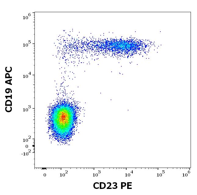 Graphic display: gated CD45 positive lymphocytes displayed as SingleFlowEx CD23 PE versus CD19 APC