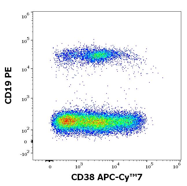 Graphic display: scatter gated lymphocytes displayed as SingleFlowEx CD38 APC-Cy™7 versus CD19 PE