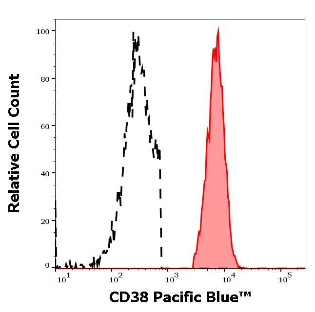 Example of separation of positive (red-filled) and negative (black-dashed) events using SingleFlowEx CD38 Pacific Blue™