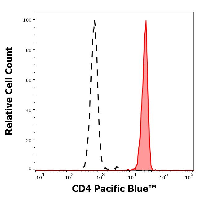 Example of separation of positive (red-filled) and negative (black-dashed) events using SingleFlowEx CD4 Pacific Blue™