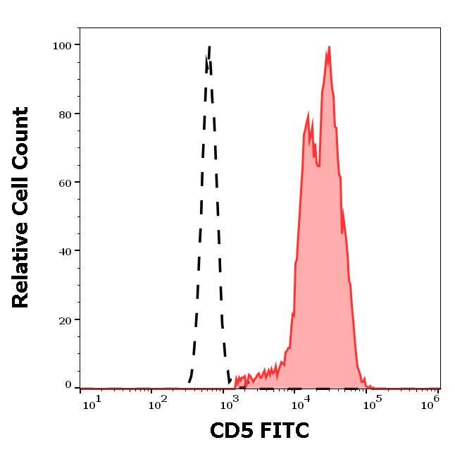 Example of separation of positive (red-filled) and negative (black-dashed) events using SingleFlowEx CD5 FITC