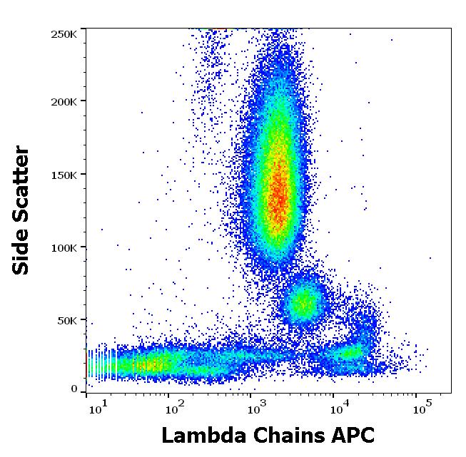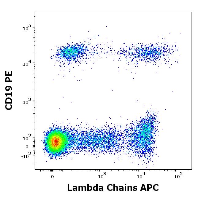 Graphic display: gated CD45 positive lymphocytes displayed as SingleFlowEx Lambda Chains APC versus CD19 PE