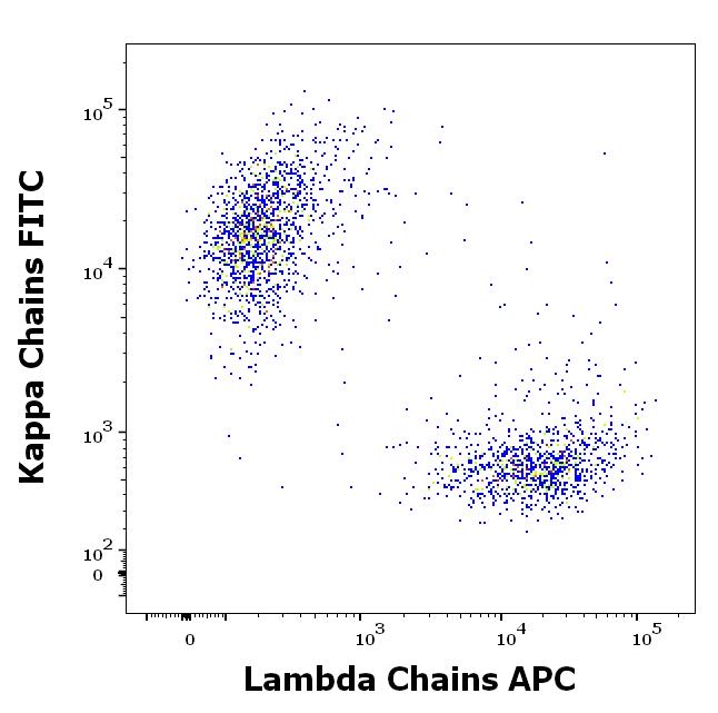Graphic display: gated CD45 positive CD19 positive lymphocytes displayed as SingleFlowEx Lambda Chains APC versus Kappa Chains FITC