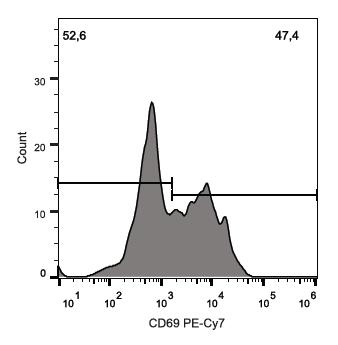 Histogram showing activation of NK cells in flow cytometry analysis of trophoblast cells stimulated human peripheral whole blood from patient with autoimmune fertility disorder using CD69 PE-Cy7 in NKFlowEx kit.